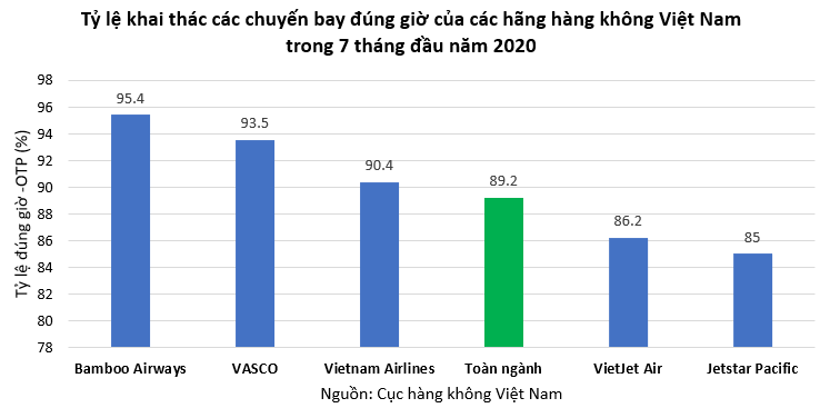 Theo số liệu của Cục hàng không Việt Nam, trong 7 tháng đầu năm 2020, các hãng hàng không Việt Nam thực hiện 124.919 chuyến bay đúng giờ trong tổng số 140.114, chiếm tỷ lệ 89,2%.