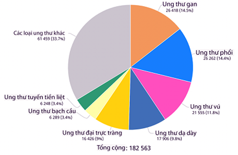 Trong 02 năm qua, Việt Nam ghi nhận 182.563 ca mắc mới ung thư. Trong đó, 05 loại ung thư phổ biến nhất hiện nay gồm ung thư gan (14,5%), phổi (14,4%), vú ở nữ (11,8 %), dạ dày (9,8%), đại trực tràng (9%).
