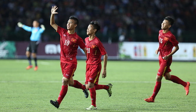 Các cầu thủ U-16 Việt Nam ăn mừng bàn thắng vào lưới U-16 Campuchia. Ảnh: ANH ĐỨC