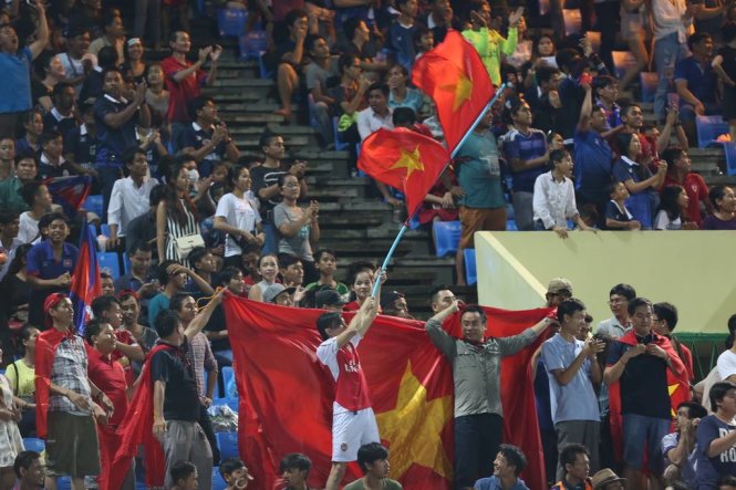 CĐV VN ăn mừng chiến thắng trước U-16 Campuchia. Ảnh: ANH ĐỨC