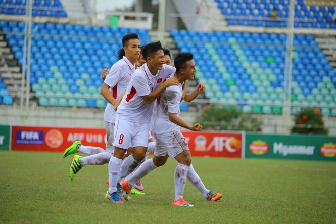 Niềm vui sau khi ghi bàn của các cầu thủ U-18 VN. Ảnh: MMF