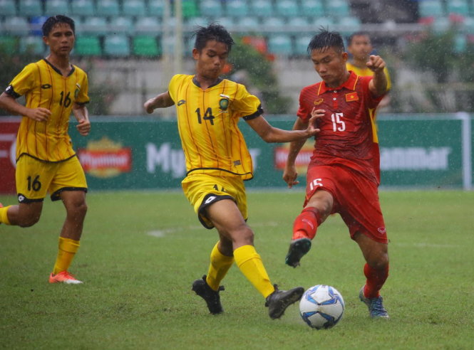 Tiền đạo Hồng Sơn (15) đột phá giữa hàng phòng thủ Brunei. Ảnh: MMF