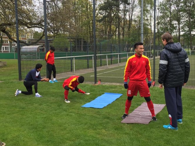 Các cầu thủ U-20 tập nhẹ tại Đức trong chiều 23-4 (giờ VN). Ảnh: Đắc Văn