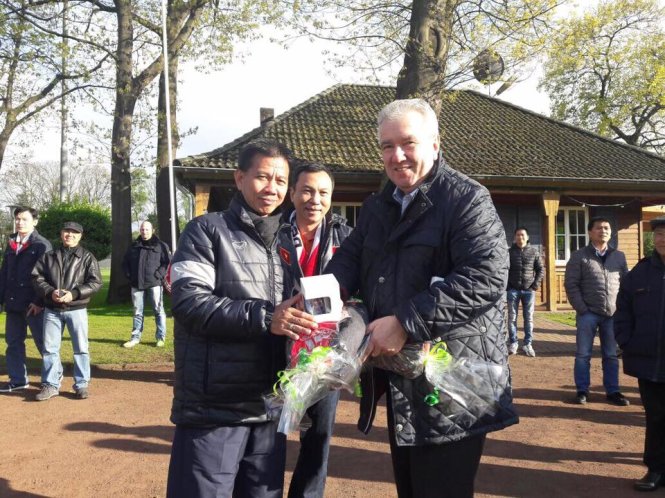 HLV Hoàng Anh Tuấn nhận hoa và quà lưu niệm từ CLB Fortuna 05 Dusseldorf. Ảnh: Đắc Văn