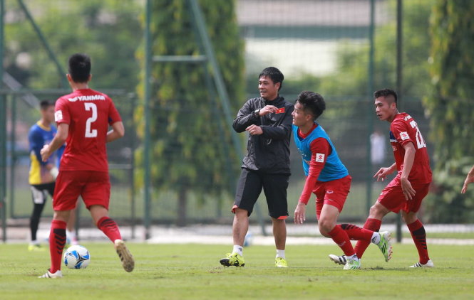 HLV Nguyễn Hữu Thắng (giữa) trong buổi tập chiều 08/7 của đội U-22 VN. Ảnh: Nam Khánh