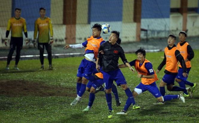 U-22 VN tích cực tập luyện trên sân Thành Long vào tối 17/7. Ảnh: N.K