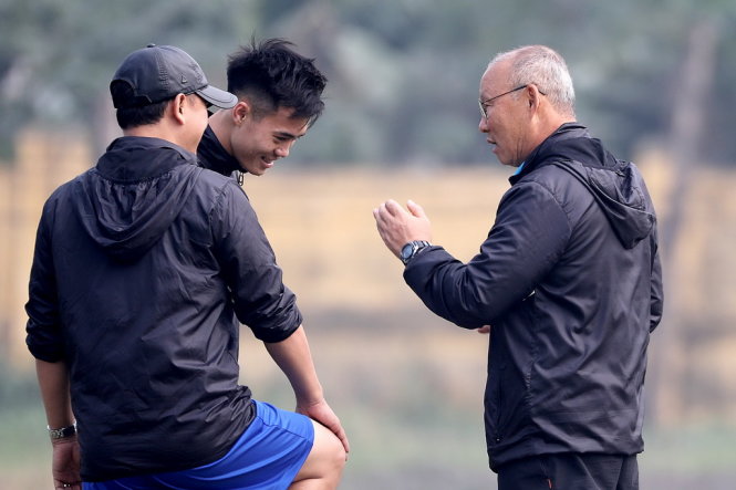 HLV Park (bìa phải) trên sân tập. Ảnh: Nam Khánh