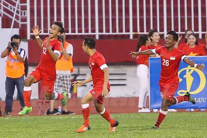 U21 Singapore (áo đỏ) đã có màn ngược dòng rất ấn tượng trong hiệp hai cuộc đối đầu với U21 Thái Lan tối qua. (Ảnh: Minh Chiến/Vietnam+)
