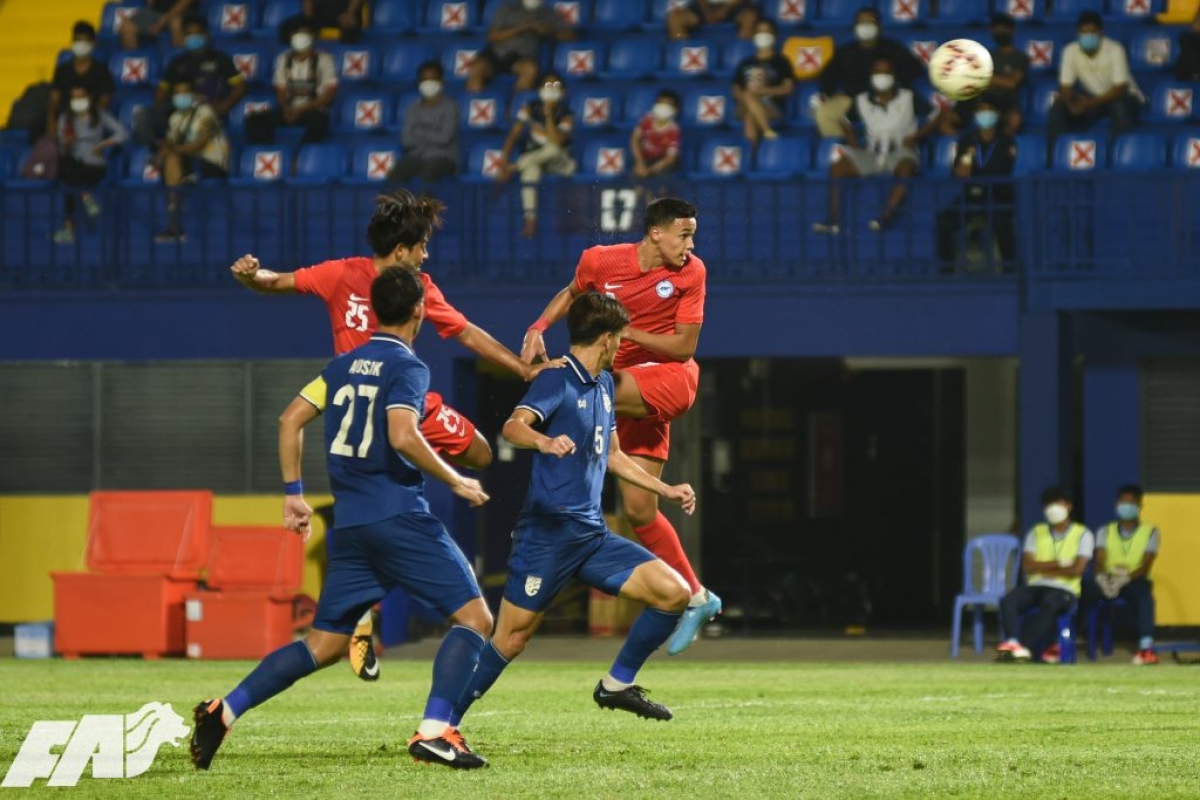 Ilhan Fandi đánh đầu mở tỷ số cho U23 Singapore trong trận gặp U23 Thái Lan. (Ảnh: FAS)