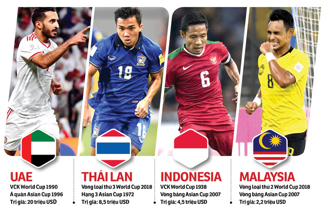 Malaysia trái lại, là một đối thủ dễ bắt nạt với UAE khi thua 9/12 lần đối đầu, trong đó có trận thua mất mặt... 10 bàn không gỡ cách đây 4 năm. Indonesia chỉ gặp UAE 4 lần (thắng 2, thua 2). Tuy nhiên, lần gần nhất Indonesia gặp UAE đã cách đây... 23 năm.