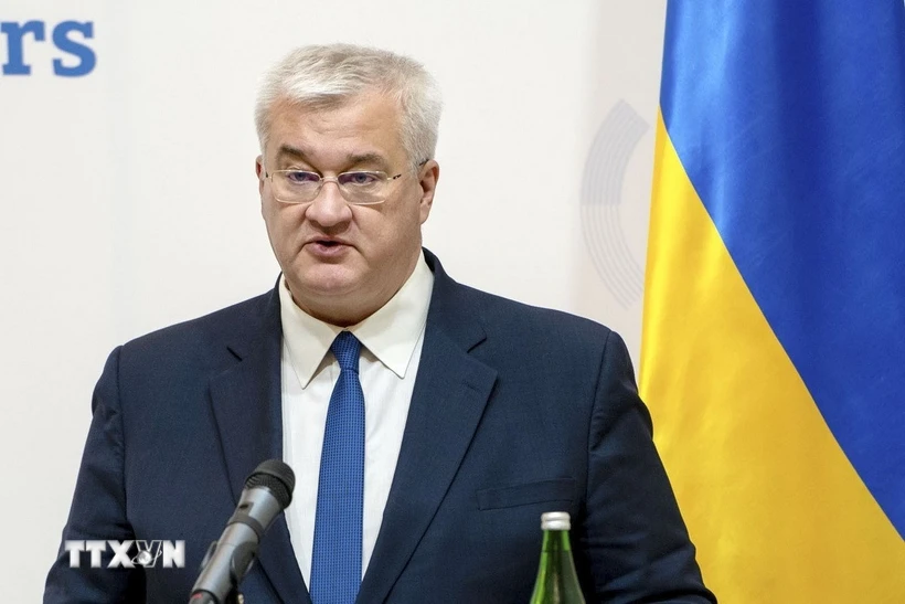 Ngoại trưởng Ukraine Andrii Sybiha phát biểu trong một cuộc họp báo ở Kiev (Ảnh: Kyodo/TTXVN)