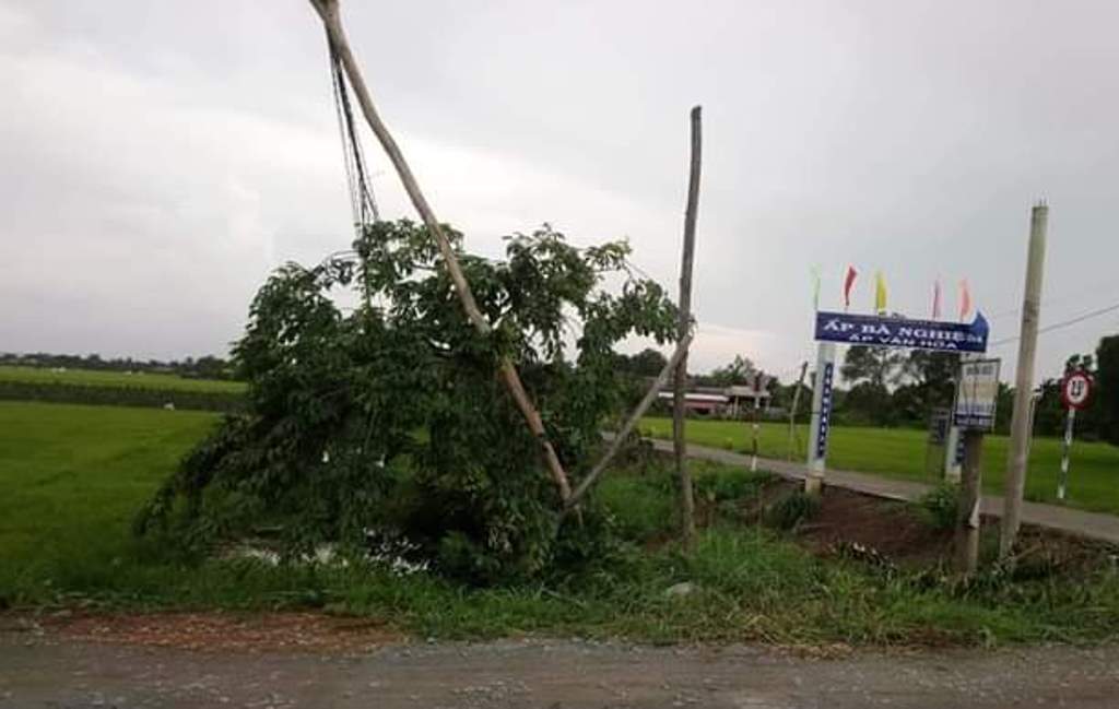 Cùng ngày, tại ấp Bà Nghiệm, xã Mỹ Lạc, huyện Thủ Thừa, trên đường vào bến đò Ngọc Cẩn, nhiều cột điện ven đường bị gió giật đổ ngã gây nguy hiểm cho người tham gia giao thông.