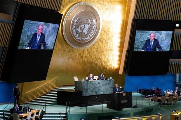 Tổng thư ký Liên hợp quốc Antonio Guterres phát biểu tại phiên họp của Đại hội Đồng Liên hợp quốc ở New York (Mỹ) nhân dịp kỷ niệm 40 năm thông qua Công ước Luật Biển, ngày 8/12/2022. (Ảnh: THX/TTXVN)