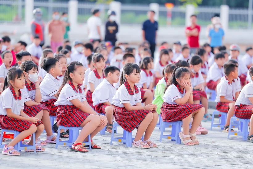 Học sinh trong buổi sinh hoạt dưới cờ. (Ảnh: TTXVN phát)