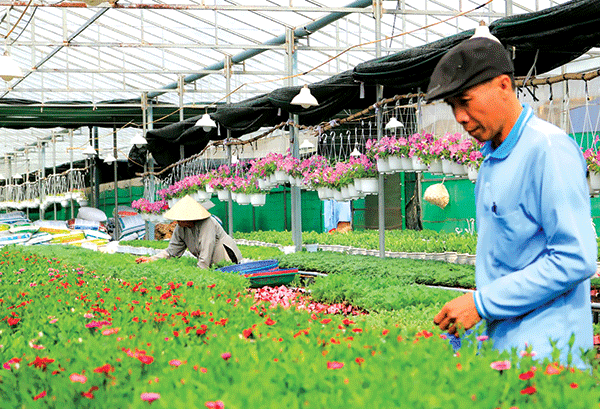 Canh tác hoa trong nhà lưới giúp gia đình ông Phan Minh Mẫn chủ động được thời vụ sản xuất, tăng chất lượng cây trồng.
