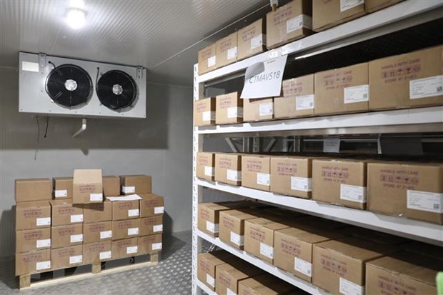 Vaccine tiếp nhận được bảo quản tại kho vaccine tiêm chủng quốc gia (Viện Vệ sinh dịch tễ Trung ương) ở nhiệt độ từ 2-8 độ C. (Ảnh: Minh Quyết/TTXVN)