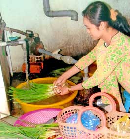 | Chị Trần Kim Tuyền ở tổ 5, ấp Mỹ Phước, xã Mỹ Khánh, huyện Phong Điền sử dụng nước sạch trong sinh hoạt hằng ngày. |
