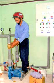 | Anh Huỳnh Văn Khoa, nhân viên quản lý Trạm cấp nước ấp Mỹ Phước kiểm tra thiết bị vận hành đảm bảo cung cấp nước cho người dân. |