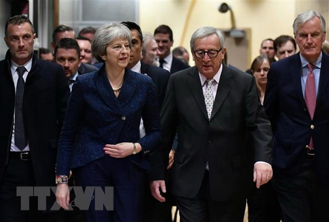 Chủ tịch Ủy ban châu Âu Jean-Claude Juncker (giữa) và Thủ tướng Anh Theresa May (trái) tại Brussels, Bỉ ngày 24/11. (Ảnh: AFP/TTXVN)