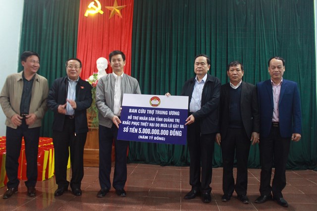Dịp này, Ban Cứu trợ Trung ương đã trao tặng Quảng Trị 5 tỷ đồng để khắc phục hậu quả mưa lũ. Từ nguồn kinh phí trên, đoàn công tác đã đến thăm hỏi, động viên và hỗ trợ 100 suất quà, mỗi suất trị giá 2,2 triệu đồng cho người dân vùng lũ thôn Tân Đức, xã Triệu Thành, tặng 5 nhà đại đoàn kết, mỗi nhà trị giá 40 triệu đồng cho những gia đình bị thiệt hại nặng do mưa lũ tại 2 xã Triệu Thành và Triệu Thượng.