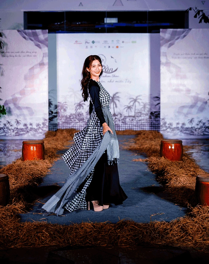 Người đẹp Phan Lê Kim Ngọc trình diễn trang phục lấy cảm hứng thiết kế từ khăn rằn trong fashion show “Rằn”. Ảnh: CTV