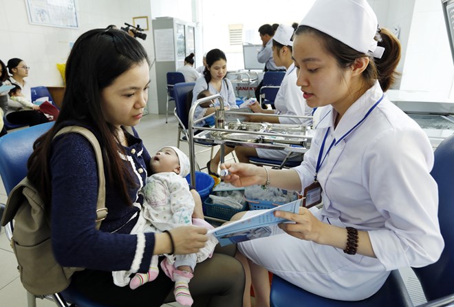 Nhân viên y tế làm thủ tục tiêm chủng cho trẻ tại Trung tâm Y tế Dự phòng Hà Nội. (Ảnh: Dương Ngọc/TTXVN)