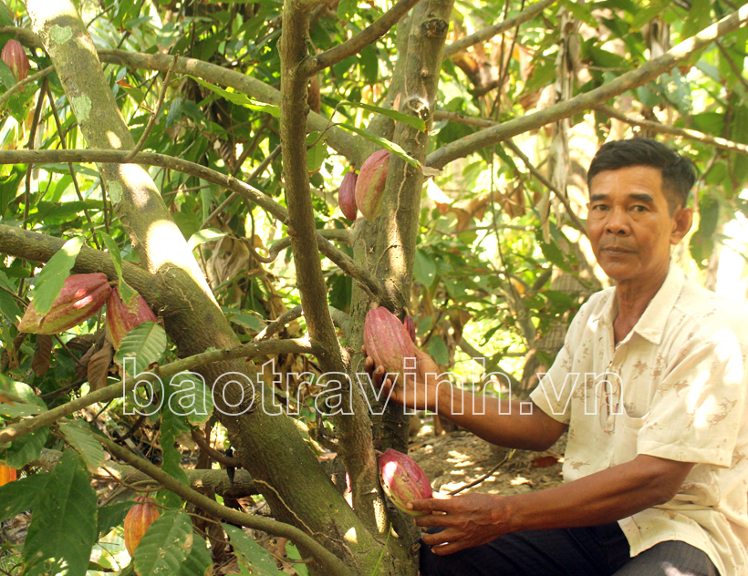Ông Kim Tràng, ấp Cầu Tre, xã Long Thới, huyện Tiểu Cần với mô hình trồng dừa xen ca cao.
