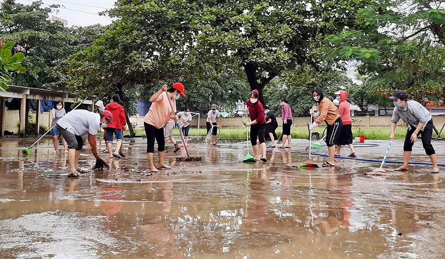 | Trường THPT Nguyễn Huệ (TP. Tuy Hòa) tập trung lực lượng dọn bùn đất để học sinh sớm trở lại trường (Nguồn ảnh: baophuyen.vn) |