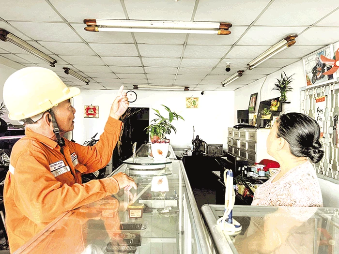 Công nhân Ðiện lực Ninh Kiều hướng dẫn khách hàng kinh doanh dịch vụ ở phường Hưng Lợi chú ý sử dụng thiết bị điện an toàn, tiết kiệm... trong sinh hoạt mua bán hằng ngày.