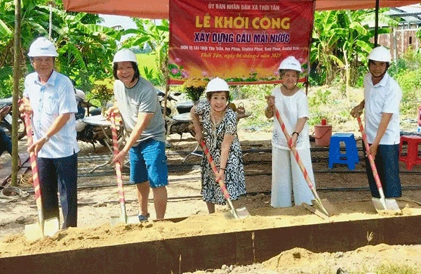 Các đại biểu thực hiện nghi thức khởi công xây dựng mới cầu Mái Nước. Ảnh do UBND xã Thới Tân cung cấp