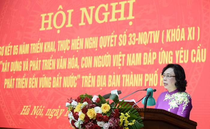 Phát biểu chỉ đạo tại Hội nghị, Phó Bí thư thường trực Thành ủy Hà Nội Ngô Thị Thanh Hằng biểu dương, ghi nhận và đánh giá cao những kết quả đã đạt được của các địa phương, đơn vị trong việc thực hiện Nghị quyết 33 của Đảng. Đồng chí nhấn mạnh, việc xây dựng và phát triển văn hóa và con người Thủ đô đã có bước phát triển mới đáng tự hào. Đời sống văn hóa, tinh thần của người dân được nâng lên rõ rệt. Văn hóa đang thực sự trở thành trung tâm trong chính sách phát triển của Hà Nội, tạo nền tảng tinh thần vững chắc cho phát triển kinh tế - xã hội Thủ đô. Những kết quả và thành tựu to lớn bước đầu đạt được thể hiện tình cảm và trách nhiệm của Thủ đô trước tin yêu của cả nước với tinh thần "Cả nước vì Hà Nội, Hà Nội vì cả nước".
