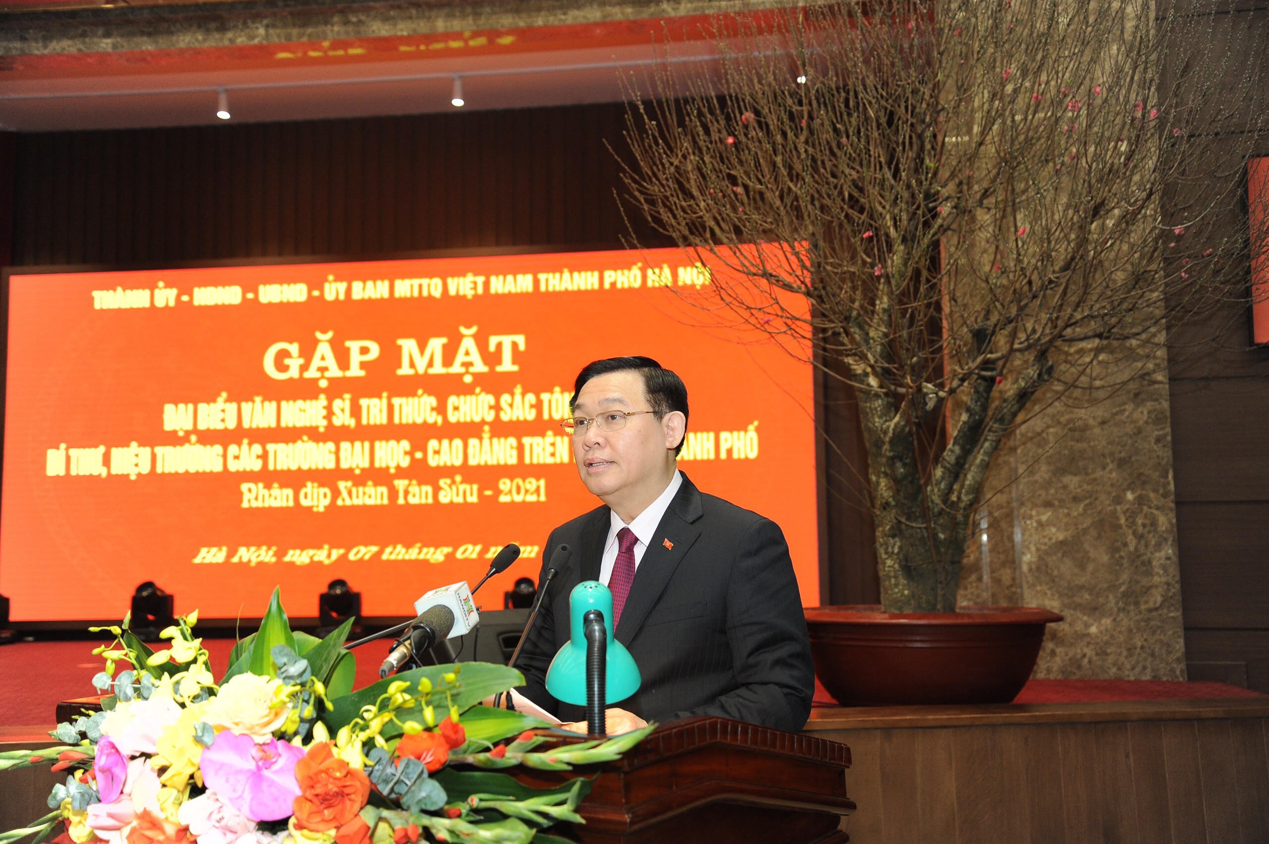 Phát biểu tại buổi gặp mặt, Bí thư Thành ủy Hà Nội Vương Đình Huệ gửi lời thăm hỏi chân tình và lời chúc mừng tốt đẹp nhất tới hội viên các hội chuyên ngành của Liên hiệp Các hội Khoa học và Kỹ thuật Hà Nội, Hội Liên hiệp văn học nghệ thuật Hà Nội, các chức sắc, tín đồ tôn giáo, các nhà giáo, cán bộ, công nhân, viên chức và toàn thể sinh viên các trường đại học, cao đẳng trên địa bàn thành phố.