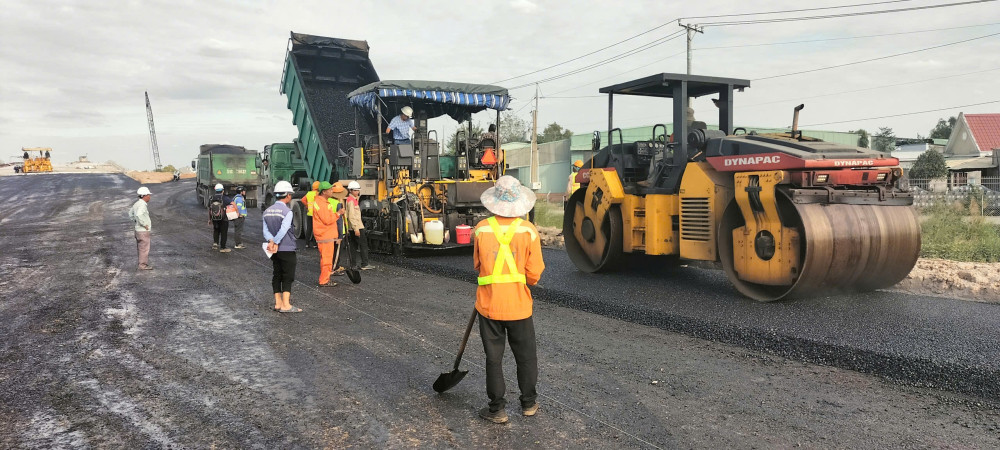 Máy móc và nhân lực đang tập trung thi công thảm nhựa
