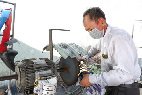 Ông Phạm Hoàn Thành có hơn 40 năm kinh nghiệm trong nghề đánh bóng lư đồng
