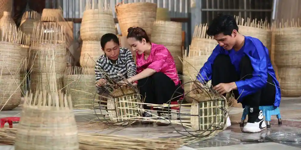 Các nghệ sĩ khách mời tại làng nghề đan đát, làm cần xé ở Củ Chi.