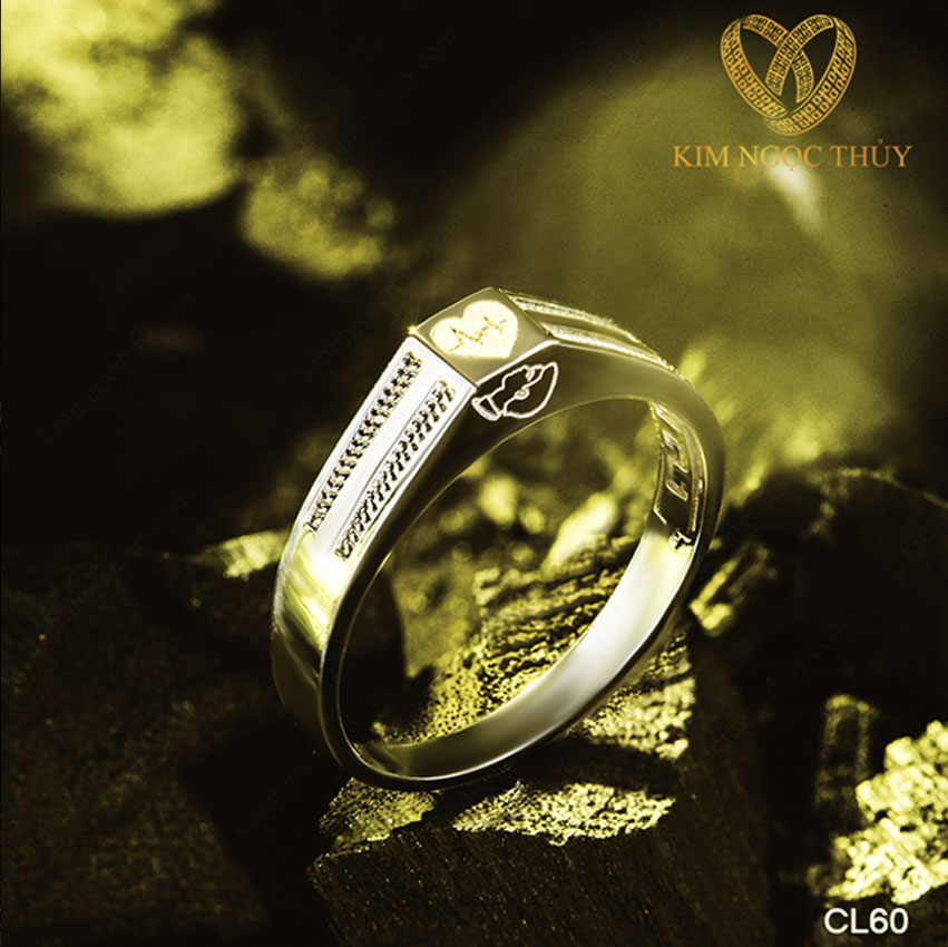 Mẫu nhẫn CL60 vàng trắng hiện đại, thời trang. Hai bên đai nhẫn sẽ được đính một hàng đá tấm tinh tế kết hợp khung chạy bị bao lấy đá. Trên mặt nam châm của hai chiếc nhẫn sẽ được vẽ họa tiết trái tim với nhịp tim đập. Như gợi liên tưởng đến việc chung nhịp đập với nhau khi “hút lấy nhau”. Sắc trắng trong trẻo còn biểu tượng cho một tình yêu thuần khiết, trong trẻo, hôn nhân tươi sáng của vợ chồng.