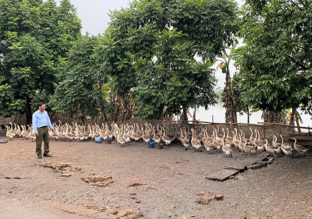 | Ông Chuyển bên đàn ngỗng cao sản trong trang trại thu lợi về cho gia đình hàng trăm triệu đồng mỗi năm. Ảnh: KC |