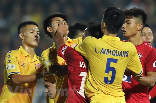 Hậu vệ Văn Hạnh (áo đỏ) xô xát với cầu thủ Nam Định ở vòng 4 giai đoạn hai V-League 2020.