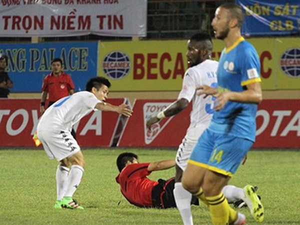 Ức chế vì bị từ chối penalty, các cầu thủ Hà Nội T&T đã vây lấy trọng tài Công Khanh để phản đối. Đáng chú ý, Văn Quyết đã có xô ngã "ông Vua sân cỏ."
