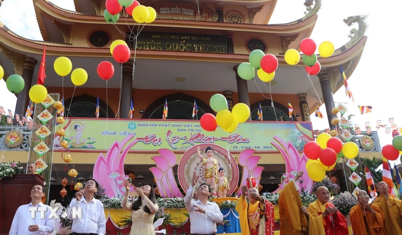 Chư tăng và các đại biểu thả bóng bay cầu nguyện hòa bình trong Lễ Phật đản 2024 (Ảnh: Hồng Thái/TTXVN)