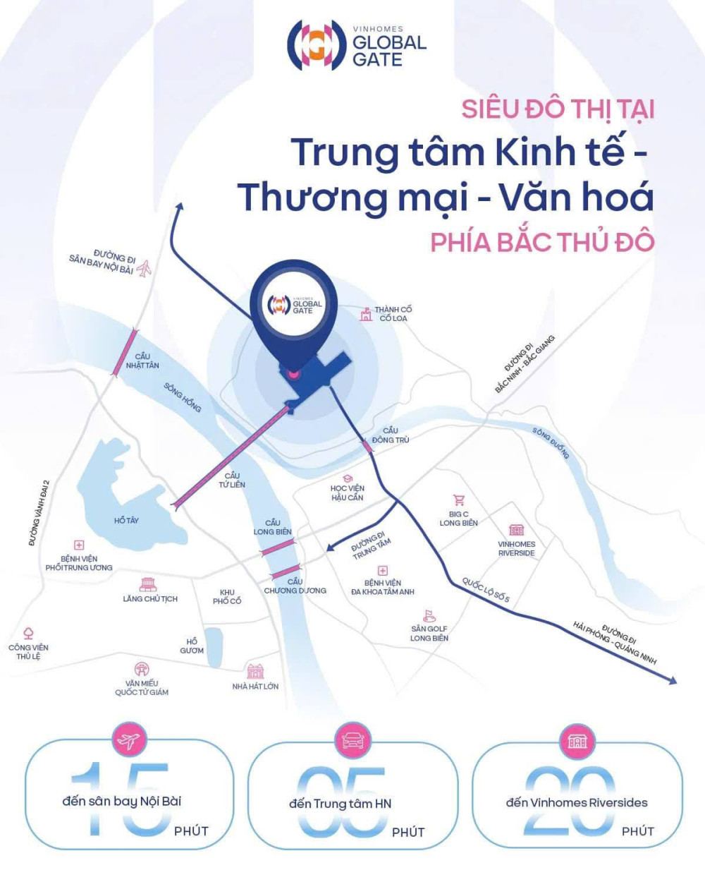Khu đô thị có liên kết vùng thuận lợi: Cách sân bay Nội Bài 30 phút; Khu công nghiệp Thăng Long 25 phút; đến sân golf Vân Trì chưa đầy 20 phút; Quận Long Biên cách dự án khoảng 5 phút; Khu di tích Cổ Loa khoảng 15 phút.