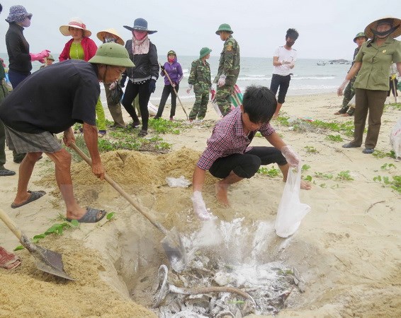 Ngư dân xã biển Đức Trạch (huyện Bố Trạch) cùng lực lượng biên phòng thu gom, chôn lấp cá chết dạt vào bờ. (Ảnh: Võ Dung/TTXVN)