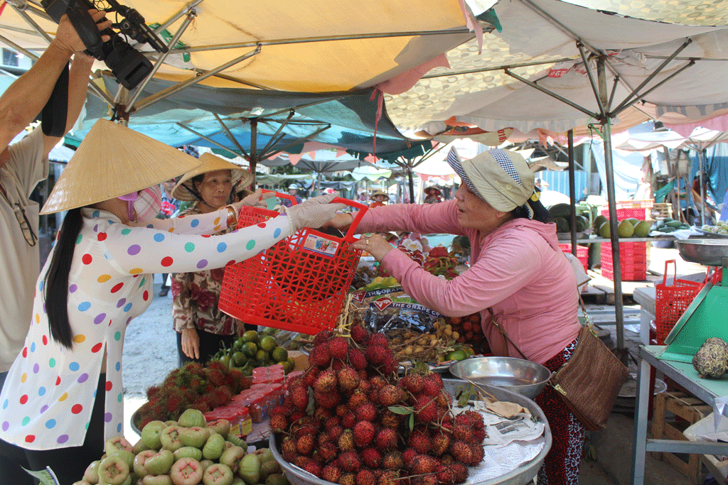 Phụ nữ ấp 4, xã Phước Lợi xách giỏ nhựa thay vì sử dụng túi nylon đi chợ