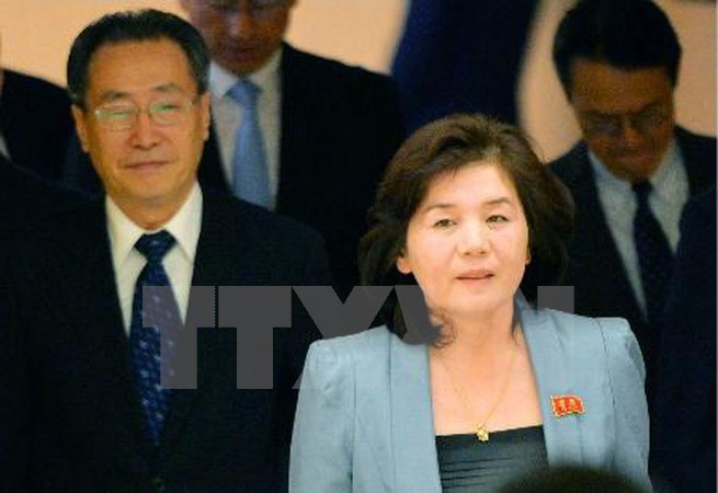 Vụ phó Vụ Bắc Mỹ thuộc Bộ Ngoại giao Triều Tiên Choe Son-hui (phải) tuyên bố các cuộc đàm phán 6 bên đã hoàn toàn thất bại. (Nguồn: Kyodo/TTXVN)