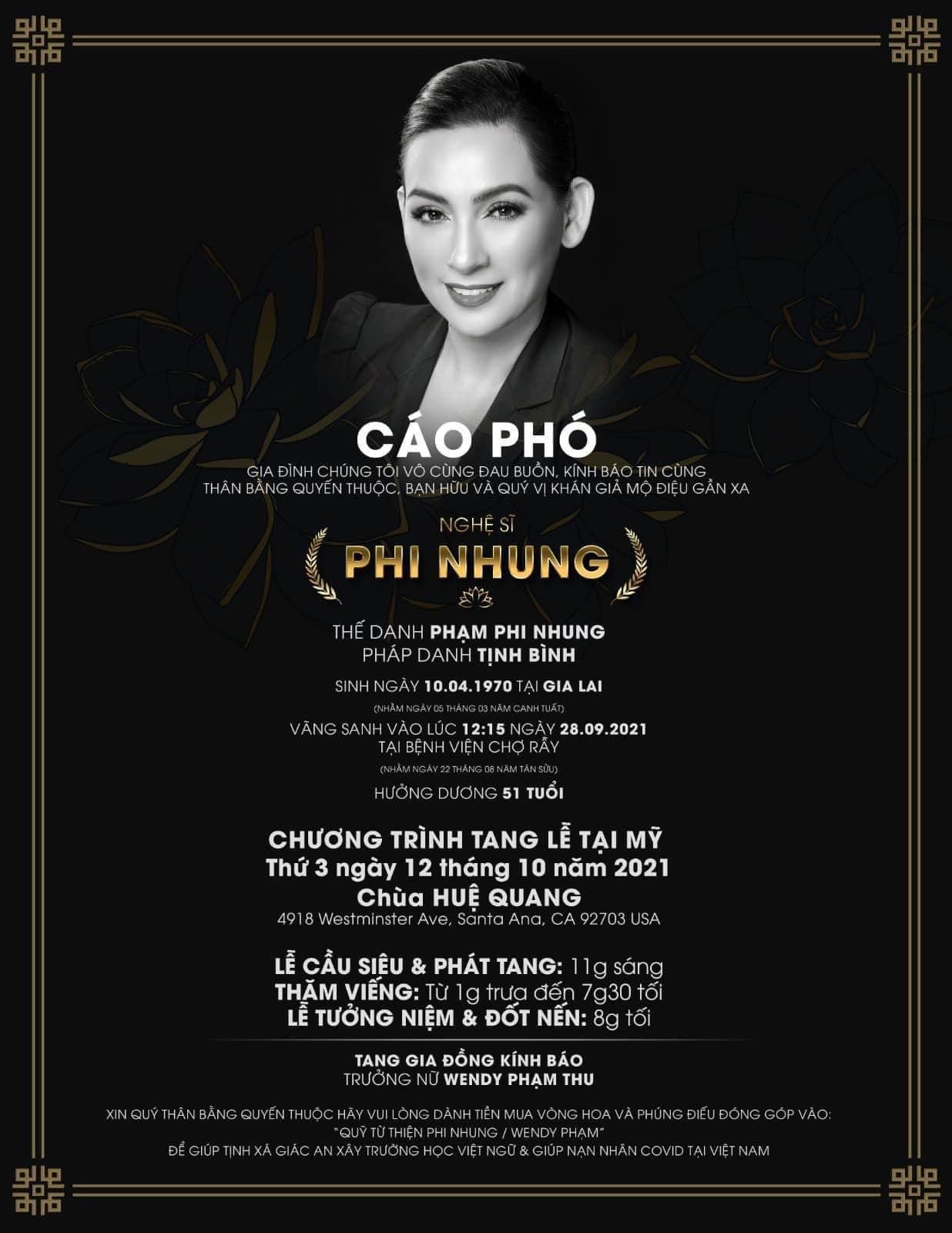 Thông tin về tang lễ của Phi Nhung tại Mỹ