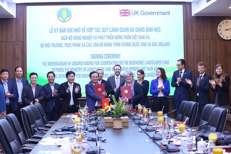 | Bộ trưởng Thérèse Coffey và Bộ trưởng Bộ Nông nghiệp và Phát triển Nông thôn Lê Minh Hoan ký Biên bản ghi nhớ để triển khai các chương trình thuộc Quỹ Đa dạng Sinh học của Vương quốc Anh tại Việt Nam |