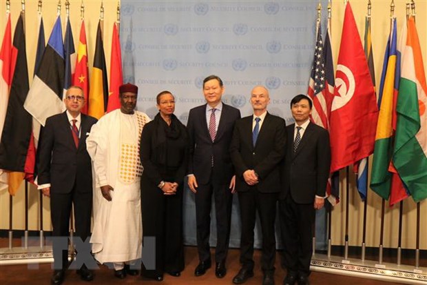 Đại sứ, Trưởng phái đoàn Việt Nam tại Liên hợp quốc chụp ảnh lưu niệm cùng Đại sứ các nước Ủy viên không thường trực Hội đồng Bảo an nhiệm kỳ 2020-2021. (Ảnh: Khắc Hiếu/TTXVN)