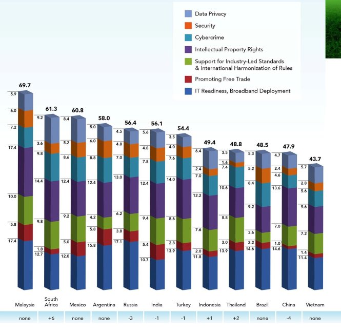 Trong đó, Việt Nam được xếp hạng 24 trên 24 nền kinh tế có ngành CNTT hàng đầu, tức là không thay đổi so với thứ hạng từ năm 2013.