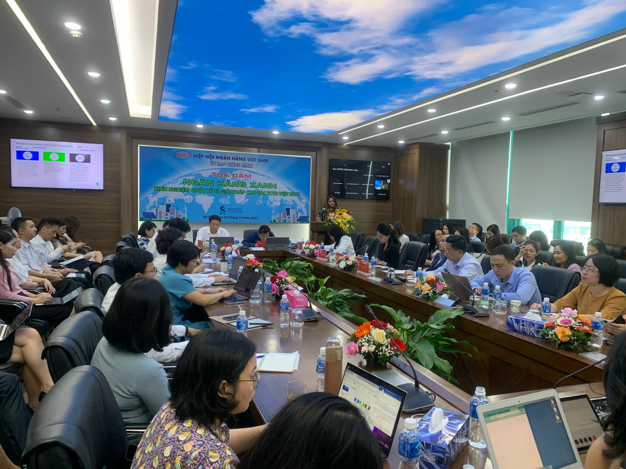 Phát biểu trực tuyến, bà Michele Wee, Tổng Giám đốc Ngân hàng Standard Chartered Việt Nam cho biết, ngân hàng này đặt mục tiêu trở thành ngân hàng dẫn đầu ngành về Phát triển bền vững và đã đặt ra các mục tiêu đầy tham vọng để đạt được lượng khí thải carbon ròng từ hoạt động được tài trợ bằng không vào năm 2050, bao gồm các mục tiêu tạm thời vào năm 2030 cho các lĩnh vực sử dụng nhiều carbon nhất. Ngân hàng đã cam kết huy động 300 tỷ USD trên toàn cầu cho tài chính xanh và chuyển đổi vào năm 2030. Cùng với cam kết về tiền tệ, ngân hàng có những mục tiêu cụ thể là dừng tài trợ cho các công ty đang mở rộng hoạt động kinh doanh than nhiệt ở cấp độ khách hàng cá nhân; giảm 85% lượng phát thải từ khai thác than nhiệt được tài trợ tuyệt đối vào năm 2030...