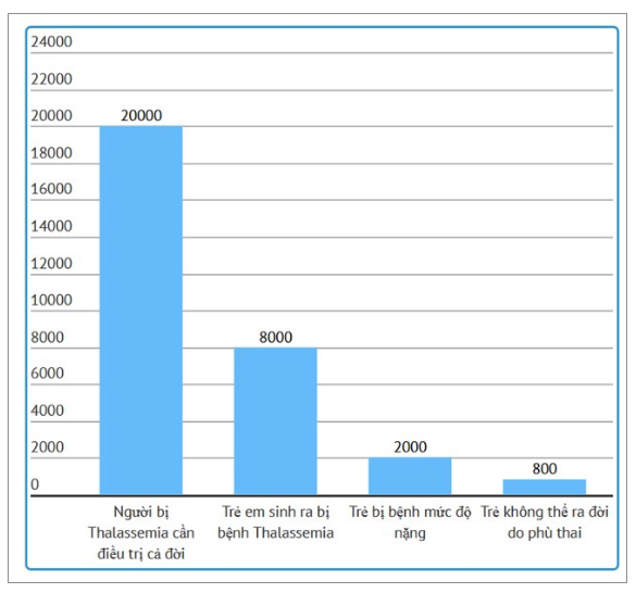Tiến sỹ Bạch Quốc Khánh, Viện trưởng Viện Huyết học - Truyền máu Trung ương cho hay, hiện nay có trên 20.000 người bị Thalassemia cần phải điều trị cả đời và mỗi năm có thêm khoảng 8.000 trẻ em sinh ra bị bệnh Thalassemia, trong đó có khoảng 2.000 trẻ bị bệnh mức độ nặng và khoảng 800 trẻ không thể ra đời do phù thai.